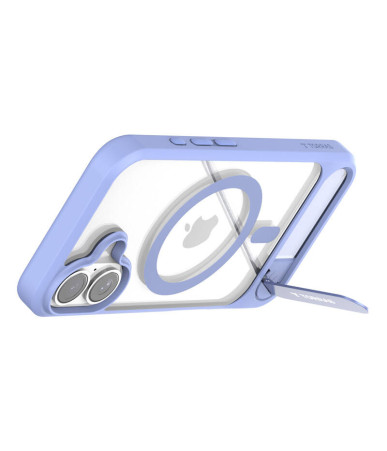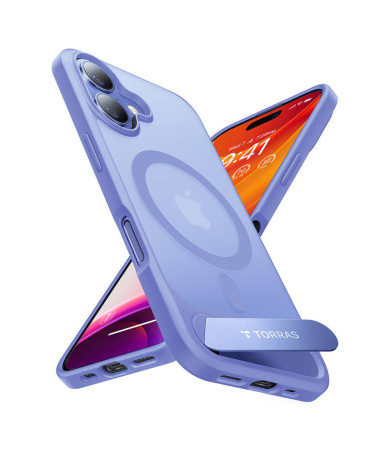 Custodia Torras Pstand per iPhone 16 in blu, con cavalletto integrato e compatibilità MagSafe. Offre protezione anti-caduta di grado militare e materiali piacevoli al tatto.
