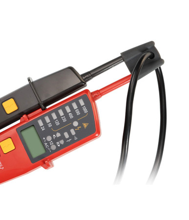 Tester di tensione e continuità UNI-T UT18E per misurazioni AC/DC fino a 1000V. Ideale per elettricisti professionisti grazie alla doppia indicazione LED/LCD e alle funzioni avanzate.