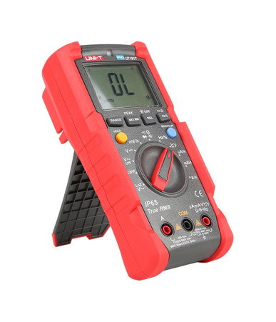 Multimetro digitale industriale IP65 con resistenza a cadute da 2m. Ideale per ambienti difficili, offre misurazioni precise di tensione, corrente, resistenza, capacità, frequenza e temperatura.