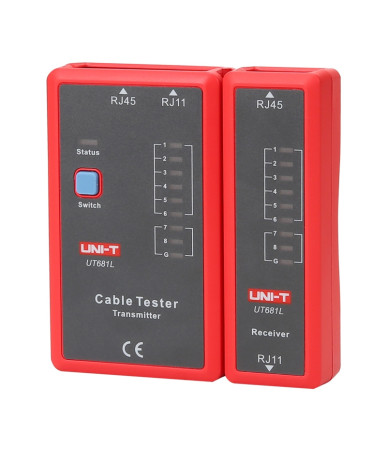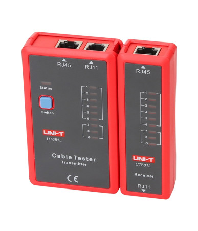 Il tester per cavi di rete UNI-T UT681L è uno strumento portatile progettato per verificare rapidamente l'integrità dei cavi Ethernet (RJ45) e telefonici (RJ11). Il dispositivo, composto da un trasmettitore e un ricevitore separabili, consente di identificare facilmente cortocircuiti, circuiti aperti e cablaggi incrociati tramite un display LED intuitivo.