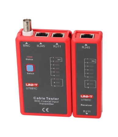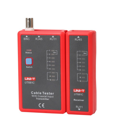 Il tester per cavi di rete UNI-T UT681C è uno strumento portatile progettato per verificare rapidamente l'integrità di cavi Ethernet (RJ45), telefonici (RJ11) e coassiali (BNC). Permette di identificare guasti comuni come circuiti aperti, cortocircuiti e inversioni di cavi.