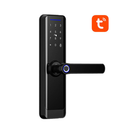 Serratura digitale smart con sblocco tramite impronta digitale, card, password, app e chiave. Controllo remoto via Wi-Fi e app Tuya/SmartLife. Ideale per porte da 35 a 60 mm.