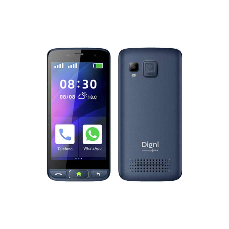 Il Digni Smart integra funzionalità pensate per la sicurezza e la facilità d'uso, come un pulsante SOS programmabile e tre pulsanti fisici per le funzioni principali (risposta/fine chiamata, home, indietro). La memoria interna è di 16GB, espandibile fino a 128GB tramite scheda microSD. Supporta la connettività 4G LTE, Wi-Fi e Bluetooth 5.0, con capacità Dual SIM. La batteria da 2500 mAh garantisce un'autonomia fino a 120 ore in standby ed è ricaricabile anche tramite una comoda base di ricarica.
