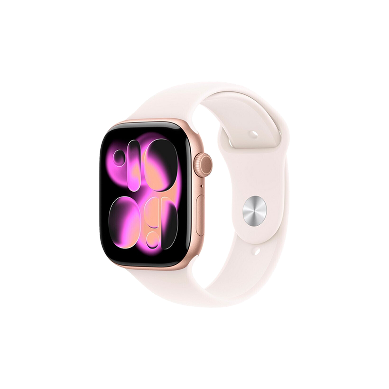 L'Apple Watch Series 11 è uno smartwatch avanzato con cassa in alluminio da 46mm color oro rosa e cinturino sportivo rosa chiaro. Offre funzionalità avanzate per il monitoraggio della salute, tra cui notifiche di ipertensione e punteggio del sonno.